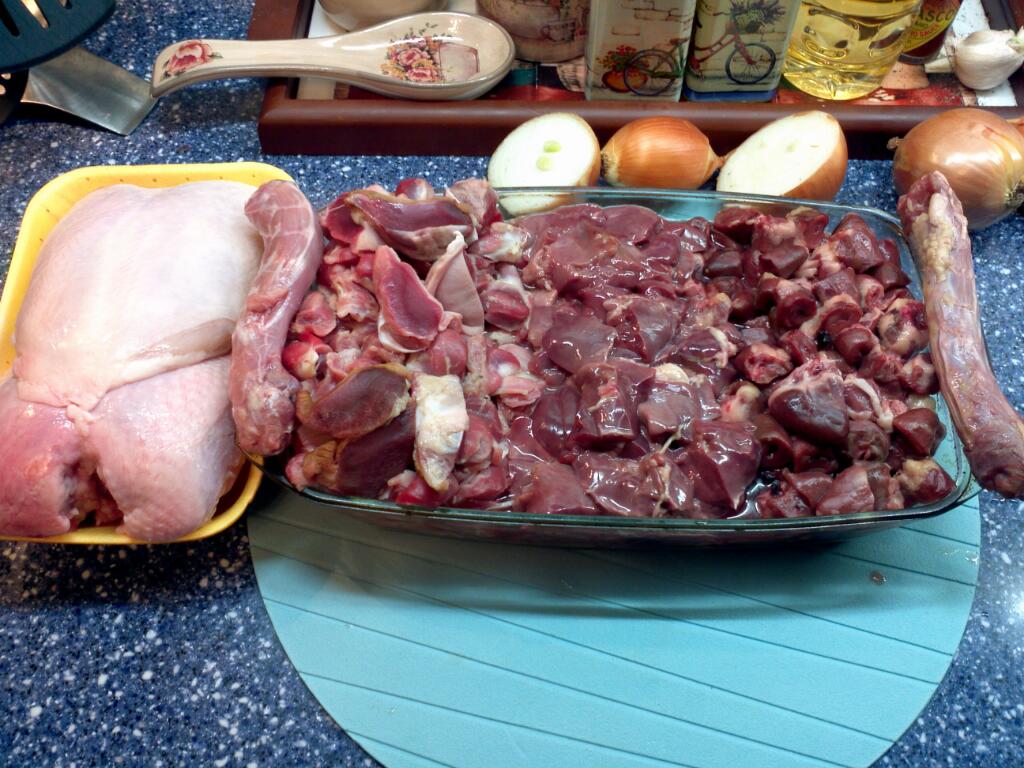 Все потрошка нарезаем, особое внимание желудкам-их надо тщательно промыть.