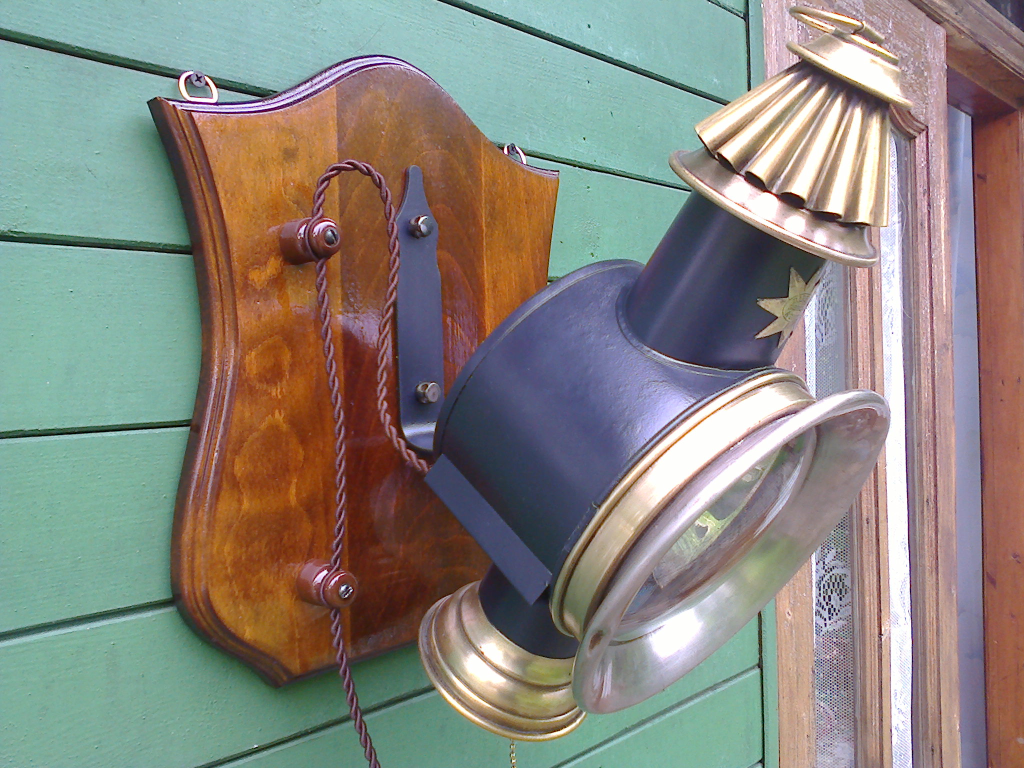 Один был почти в идеале, второй - без стекла, подмятый, короче - на опыты. Концепция возникла сразу, оставалось воплотить в натуре. Долго искал способ закрепить корпус на плакетке на наклонно-поворотном механизме, но за несколько месяцев так ничего и не нашел. Закрепил на крюке, как, собственно, и должно быть. Крюк - обточенная, загнутая и покрашенная воротная петля, крепится к плакетке оригинальным вороненным крепежом от старинного шкафа. Внутрь инсталлировал старый медный патрон 30х-40х годов прошлого века. В магазине ретроэлектрики удачно подобрались керамические изоляторы, витой шнур и лампа Эдиссона. Выключатель - на цепочке, типа "дерни за веревочку..."