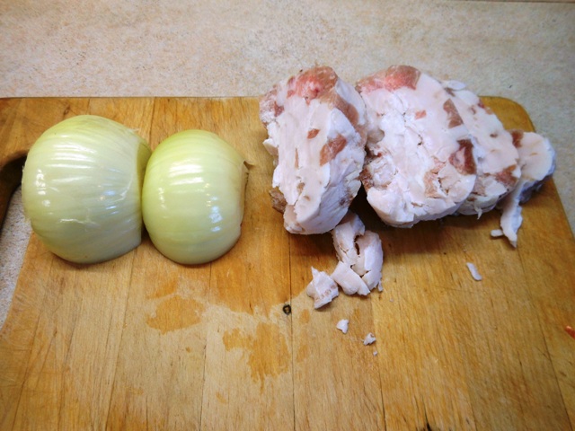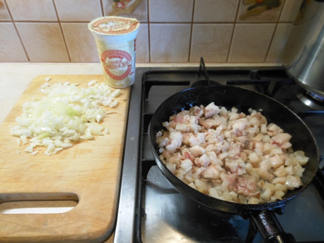 Пака цеппелины варятся. берем сало и нарезаем маленькими кубиками для шкварок. (у нас уже нарезанное сало лежит в морозильной камере в мешочках). Нарезаем лук.