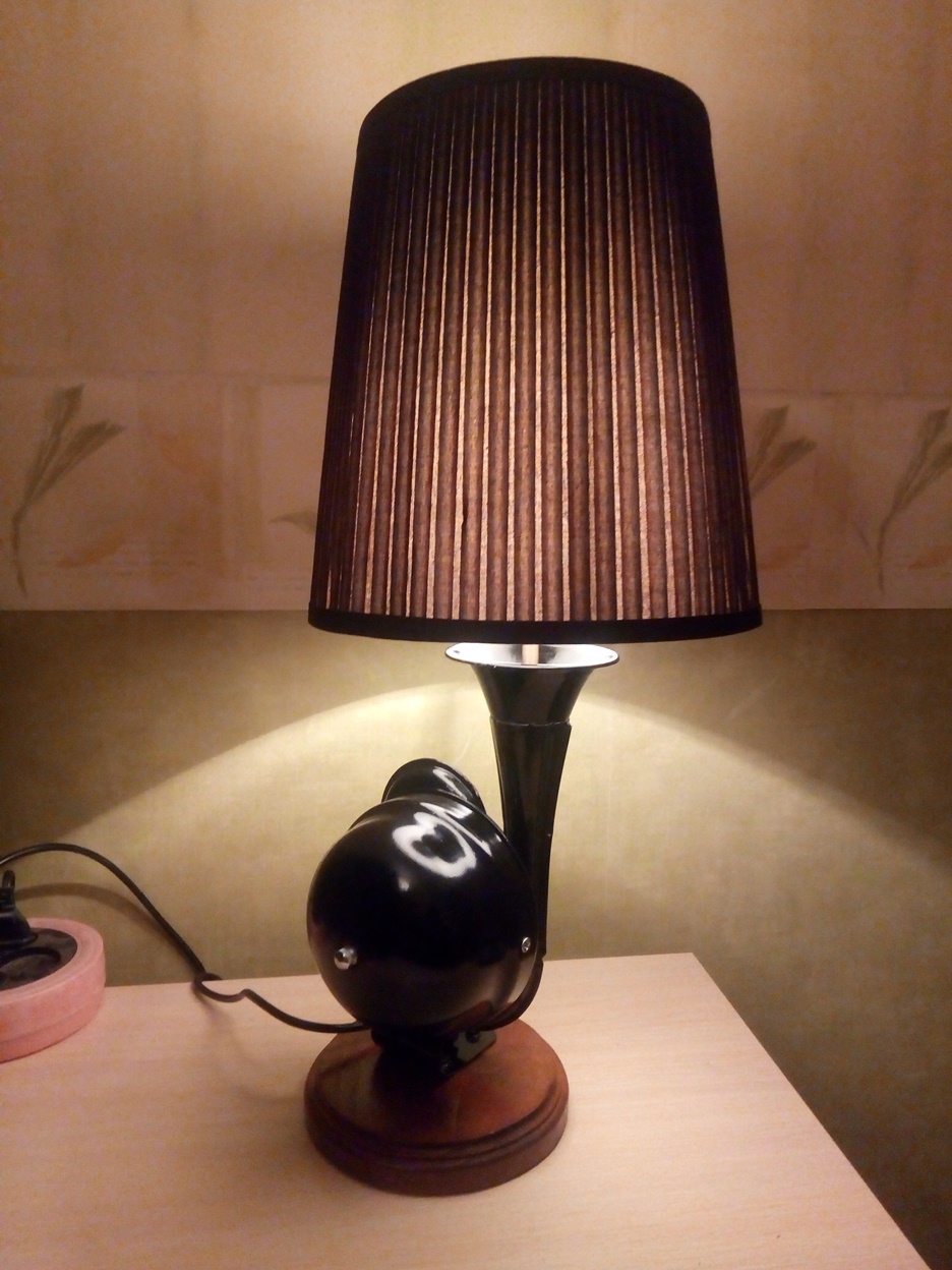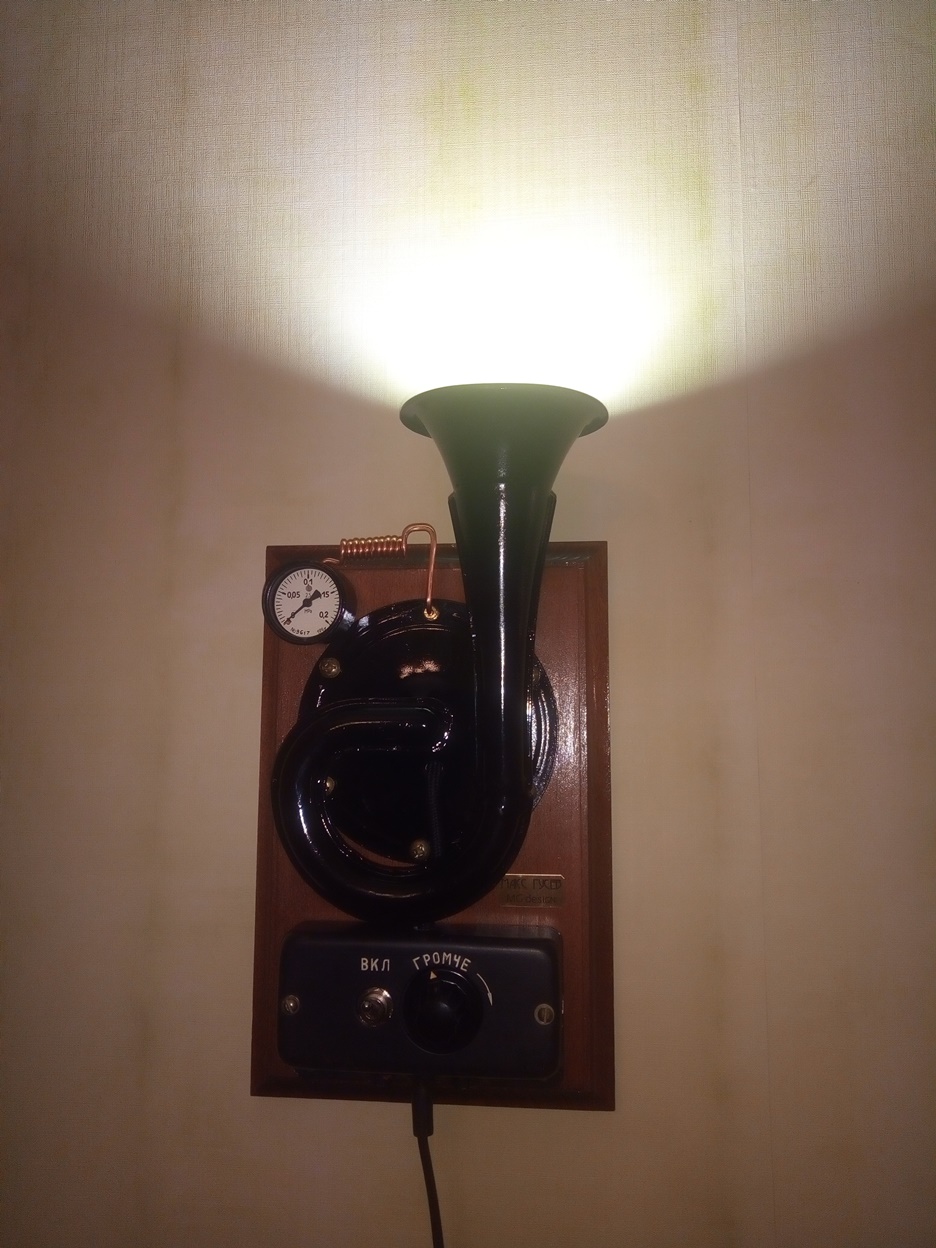 Настенный светильник. Использован пульт связи с пилотом от самолета, осевой манометр. В рожке - светодиодная лампа.