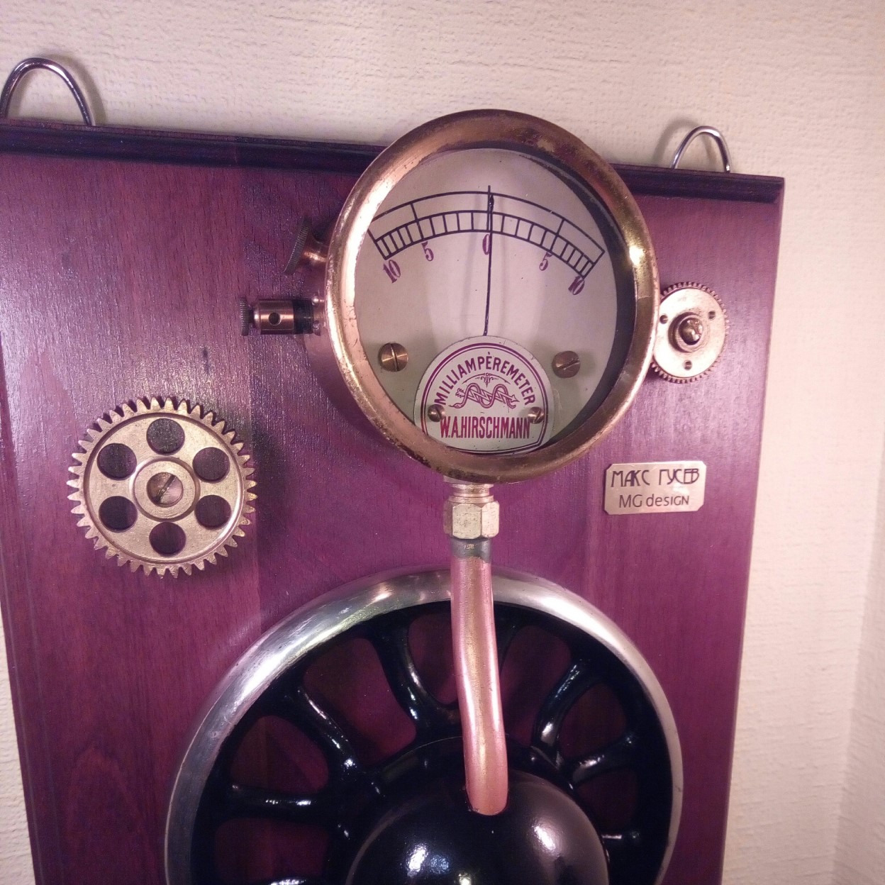 Лот №5. Бра стимпанк. Две лампы Эдисона, маховик Singer, амперметр начала XX века. Доска - мореный дуб.