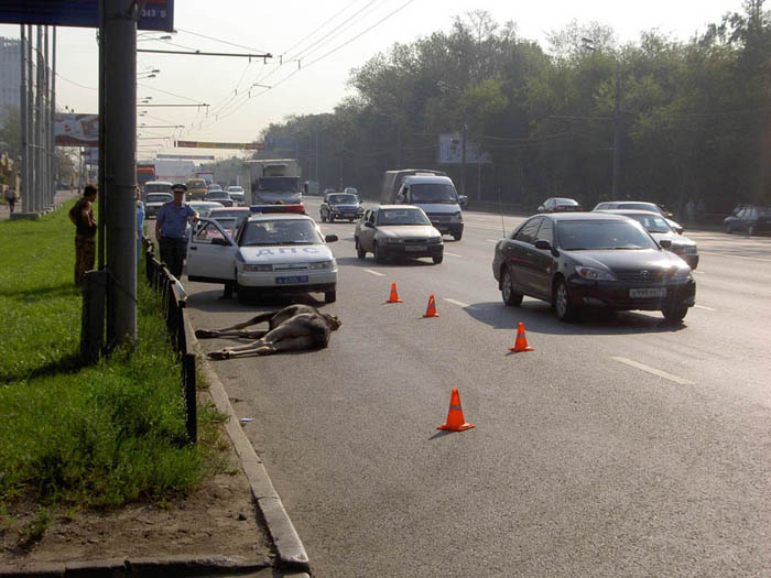 Ехал сегодня на работу. Щелковское шоссе. Прям перед офисом гляжу ГАИ, место аварии огорожено ... ну думаю сбили кого-нибудь. Подъезжаю поближу и вижу збитого молобого Лося. :shock: