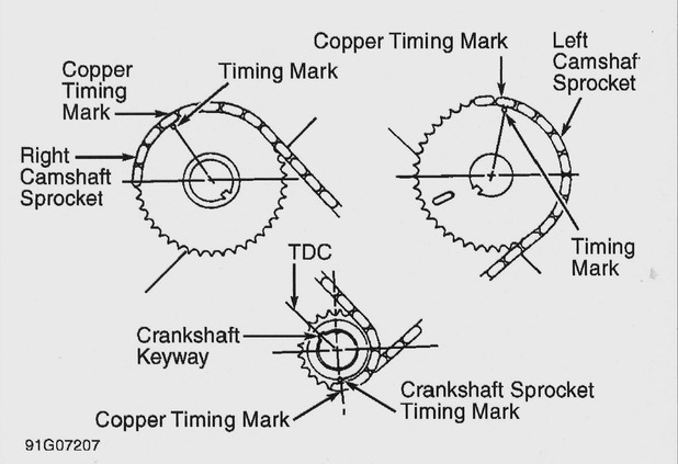 Положение шпонок определяет взаимное положение валов. Затем накладываем цепь по прямой ветке (где цепь идет прямо, а не дугой по натяжителю) и попадаем в зубья так, чтобы валы зафиксировалитсь приблизительно в таком взаимном положении. После установки натяжителей - проверить, там еще видно будет, где шпонки.