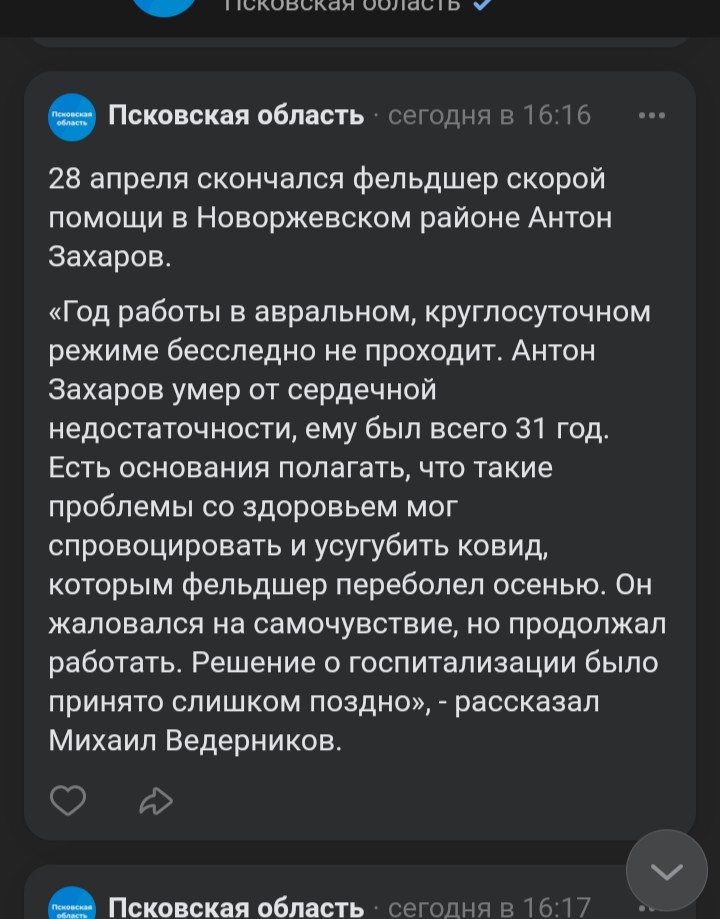 И так же мне известны ещё два печальных случая, это Женина мама и ещё мама моего знакомого из тверской области, попала в больницу с ковидом, умерла из-за тромба, было ей за 60. Но с ними я не был знаком лично.