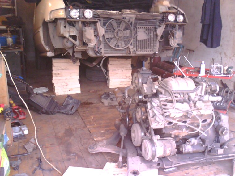 Далее встал вопрос о замене... Проштудировав интернет понял, что народ отсоединяет всё вокруг мотора и коробки, предопускает подрамник в сборе с мотором и коробкой на поддон и ......... поднимает машину вверх за перед, пока всё в сборе не окажется на свободе ... Что то я дрейфил ... На фото - пример, но ещё со старым кузовом. Но суть ясна ...