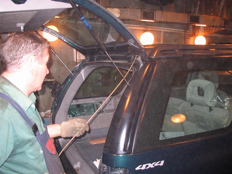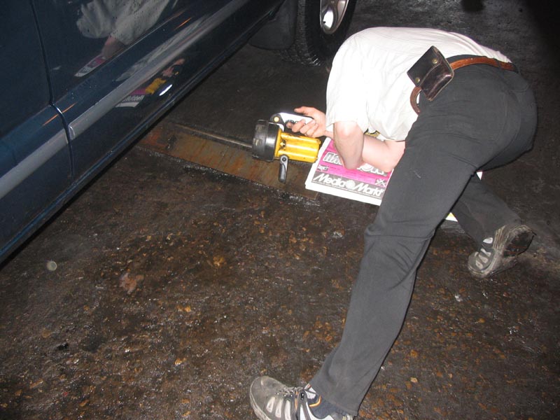 Второй – обработка мест сопряжения на поверхности кузова автомобиля всевозможного крепежа, ручек, дверей, капота двигателя, моторного отсека, дверей салона, двери задка и т.п. Для доступа в скрытые полости использовали длинные гибкие и одновременно жёсткие шланги, напоминающие внешним видом медицинские кембрики. Самого материала не жалели: из всех возможных мест – щелей, отверстий – сначала вылетала паровоздушная взвесь препарата «Rust-Stop», а затем начинал активно вытекать уже и сам антикор. Особо это было заметно при обработке дверей салона и двери задка. Именно из её углов долго стекал, а затем обильно капал желтоватого цвета препарат.