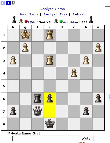 Он будет уходить от обмена до конца.Николай Пименов писал(а):Теперь надо выменять что-нибудь на что-нибудь, чтобы спаренной ладьи не было, и пробиваться одной пешкой "в дамки". Т.е. "сбить баланс"... и ещё короля бы убрать с вертикали, на которой ладьи спарены...
