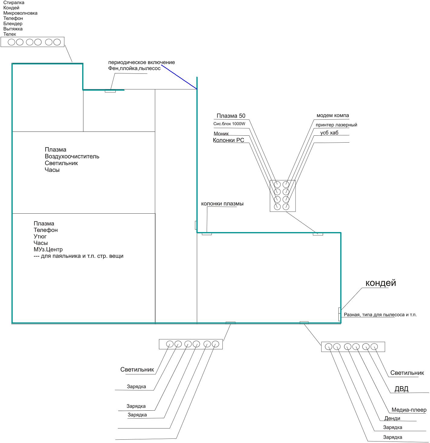 Отдельно: стиралка, силовая розетка под утюг, микроволновка (подозреваю понтовую, как у меня, на 3 кВА макс), кондеи (просто на всякий случай скорее). Остальное всё - мелочи (для сравнения: у меня только звук дом. кинотеатра - 1 кВА в пике, причем настоящих кВА от розетки, а не учебных).
