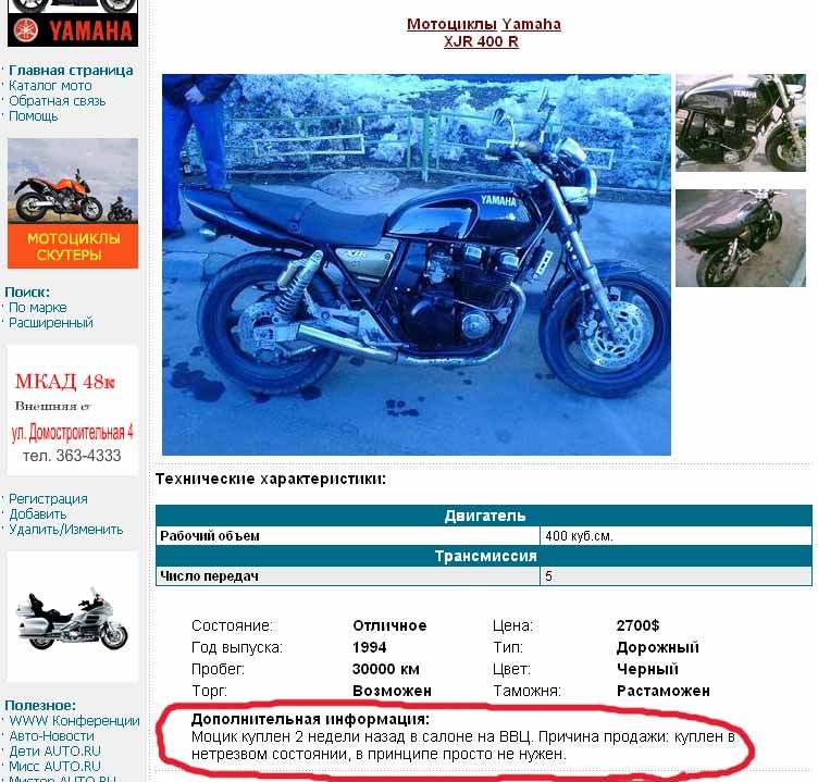 Ну да, 400 кубового внутреннего японца ток по-пьяни и можно было купить))) Кстати, салон называется mr. Moto. 2года назад туда с женой зашел мордой потрясти - в итоге уехали на Leadухе (жарко было домой на общ. тр-те ехать)... И ведь деньги нашлись, как щас помню $750 ... были же времена... Кстати салончик так себе...