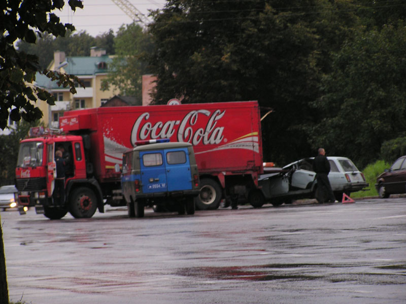 А напоследок, не очень может быть весёлая, но всё же... Ехал мужик, ничего не подозревал, и тут перед ним у грузовика Кока-Колы падает дверь-подъёмник. Сам водила вроде как увернулся, а у "четвёрки" снесена напрочь передняя стойка, да и до средней достало... В-общем - "Always Coca-Cola!"
