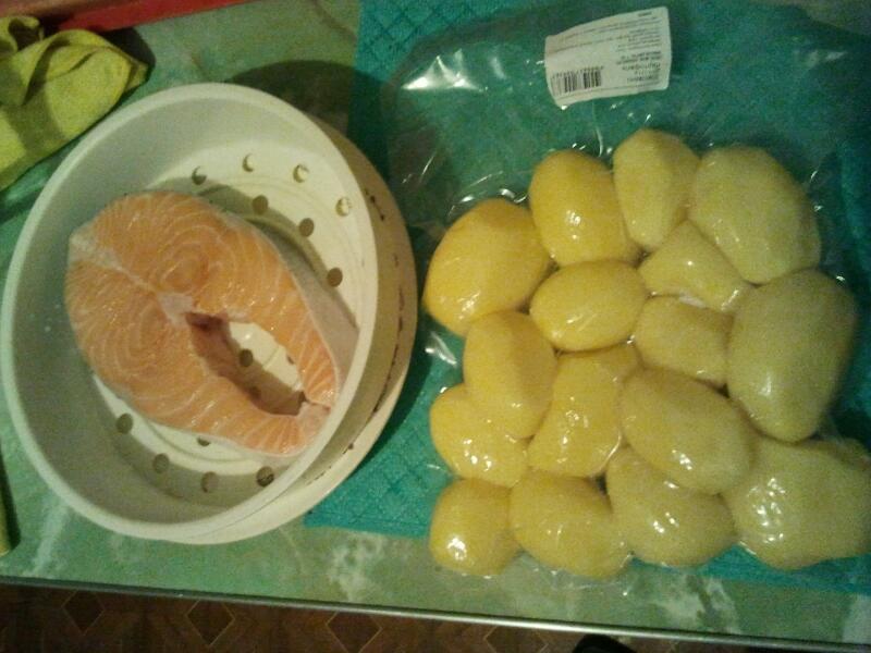 Ужин когда лень готовить. Берем стейк семги и картофан, кидаем все это в мультиварку, немного воды, соли, рыба сверху на пару, 15 минут и готово