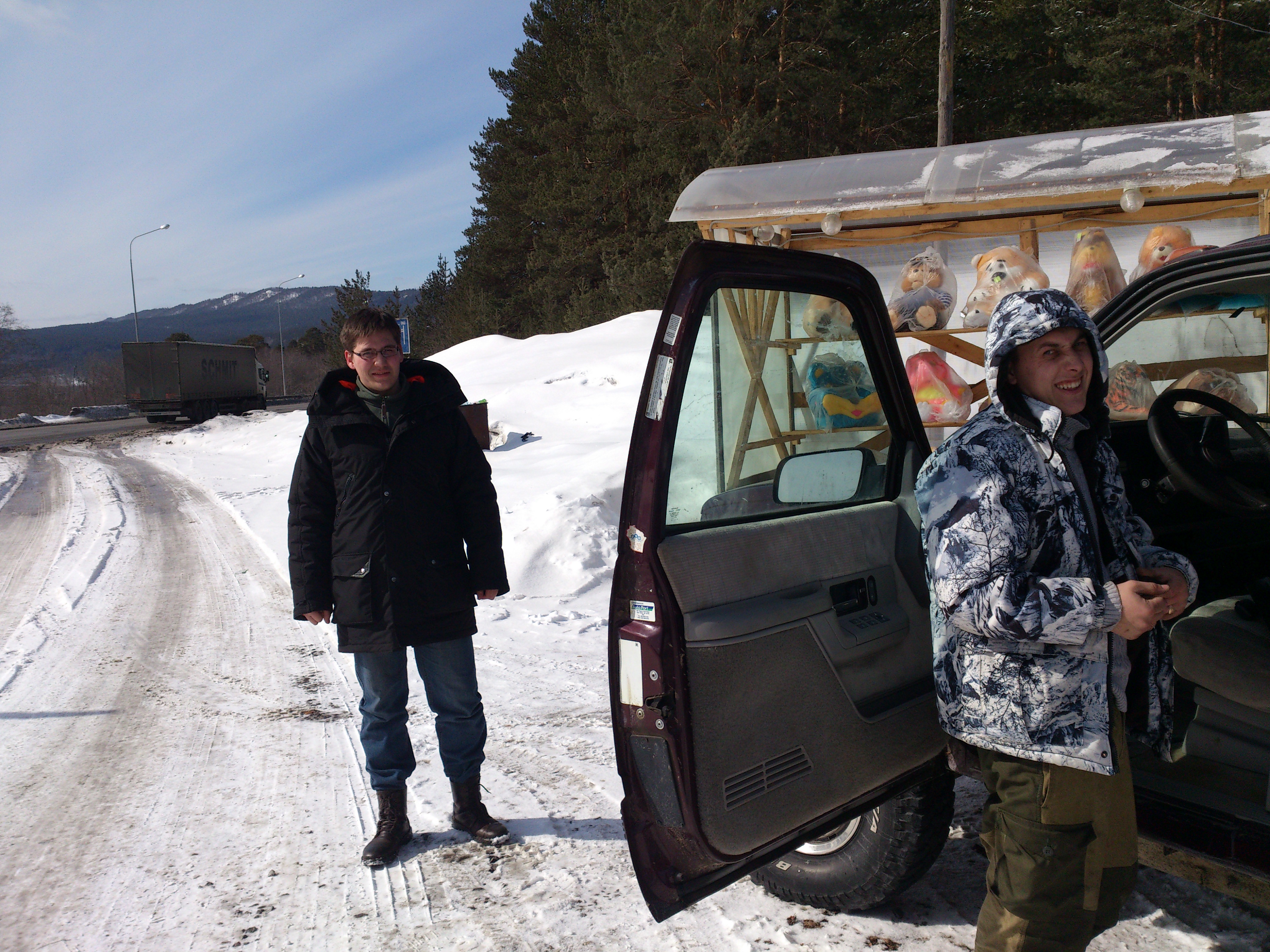 В пятницу 21-го часиков в 7 утра я с сыном медленно на полном приводе выруливал меж сосен в сторону трассы.Медленно потому,что машинка обута в МТшную резину,а она,как известно,как калоши на льду-остановить большая проблема.Оставалось надеяться на чистый асфальт в пути.
