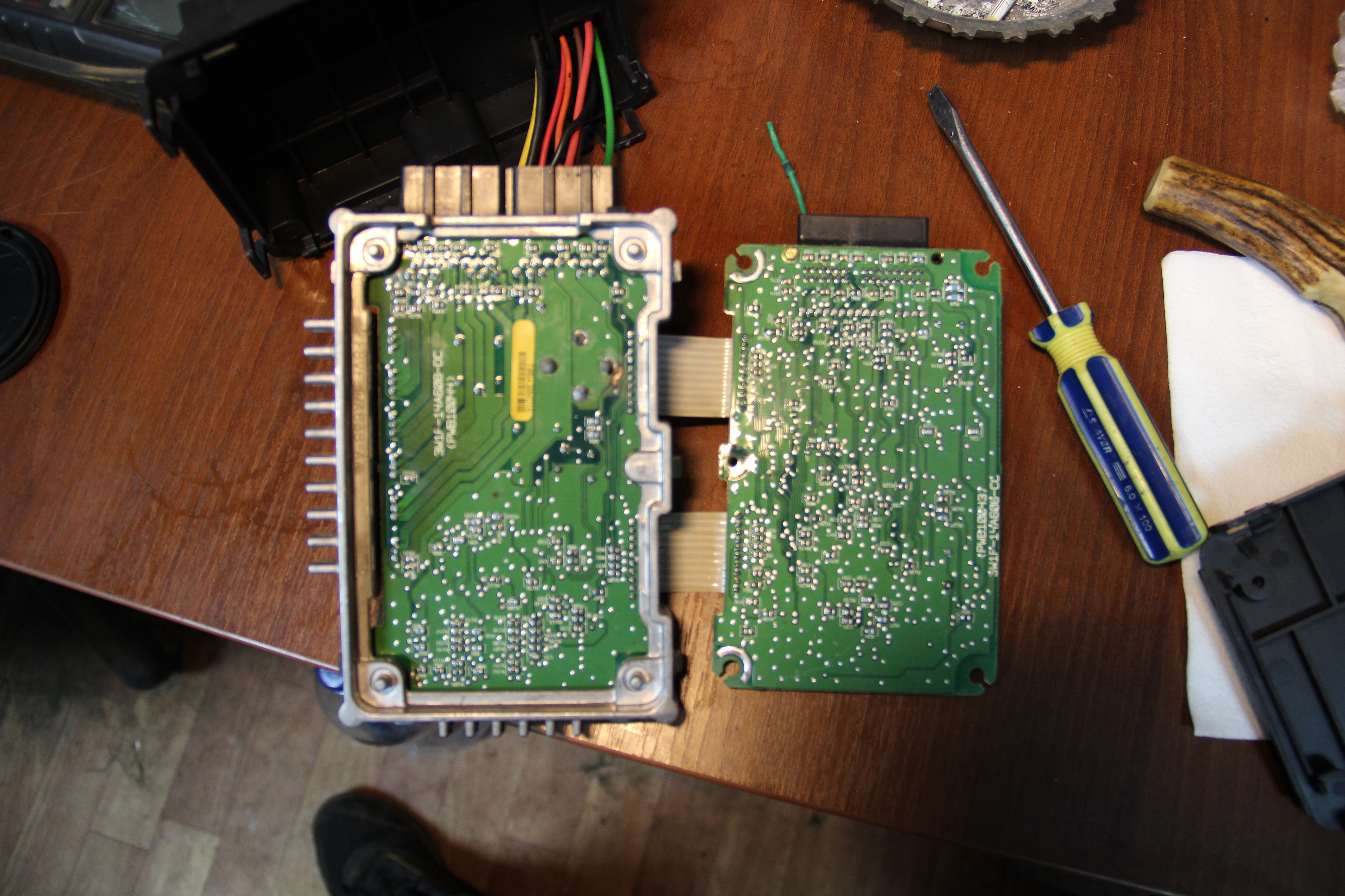 А вот на счет дальнего света горящего в правой фаре всё намного интересней, следуя опять же советам мануала пришли к выводу что блок LCM(light control modul) почемуто принудительно включает его. Значит разобрали и впринципе ничего не увидили кроме двух плат (причем двухслойных как потом оказалось),но пришли к выводу что терристор который управляет дальним на правой фаре просто или пробит или управляющий плюс от куда-то берется постоянно и решили сделать через так: терристор который управляет левый дальним светом споять с контактом который выходит на правый дальний свет(через реле конечно"стандартное вынесенное вне блока"),а старый контакт на плате просто разорвать(разрезать "вот здесь и выяснилось что плата двухслойная))), но все нормально") и все работает теперь)))