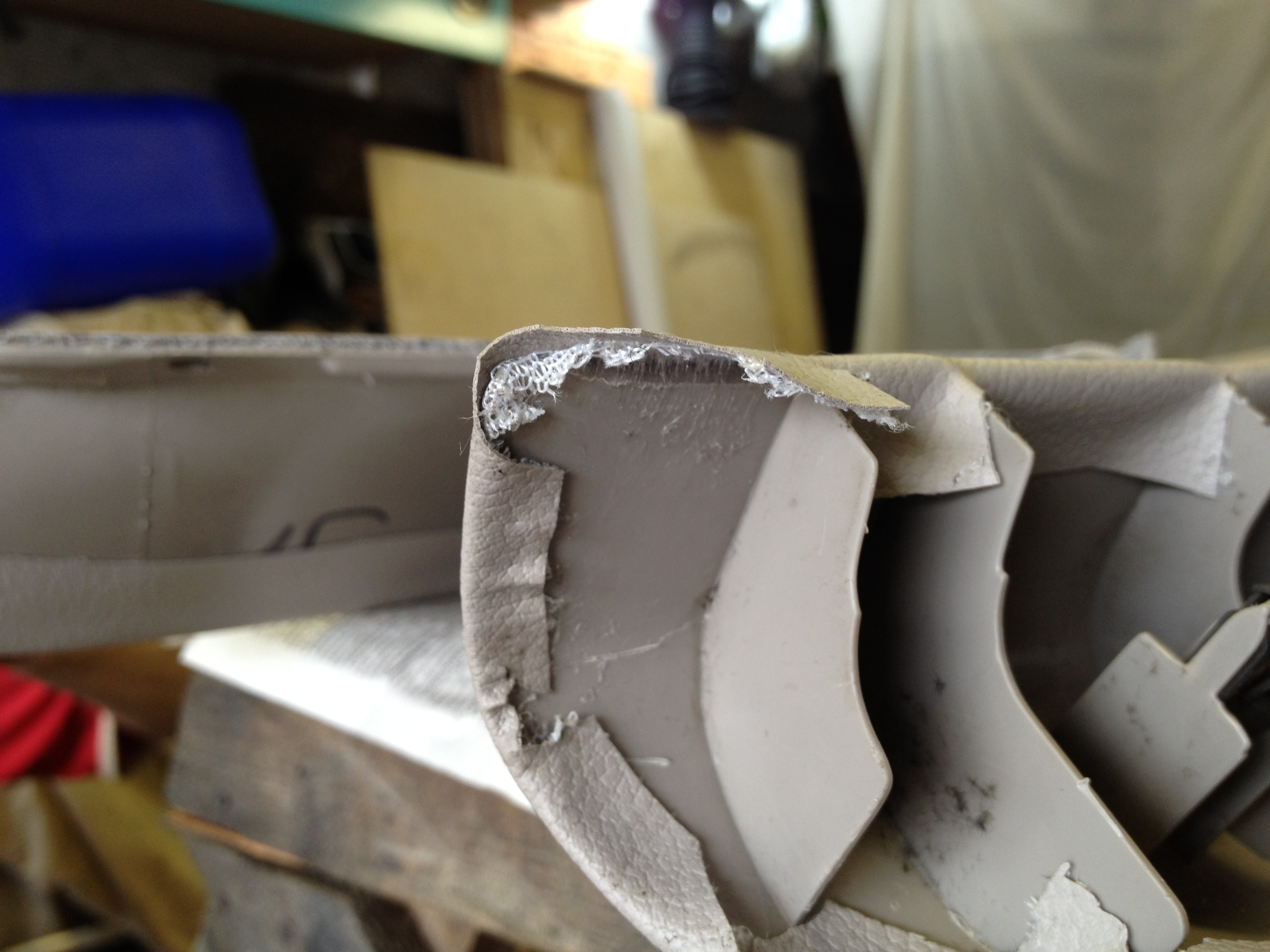 Это деталь, которая будучи обтянутой пролежала ночь в гараже. Вот такие неровности видны на обтянутых деталях из-за тонкого материала. Отслаивание клеевого слоя на сгибах, точнее в местах напряжения материала. Отслаивание армирующего слоя. Одним словом - полное УГ.