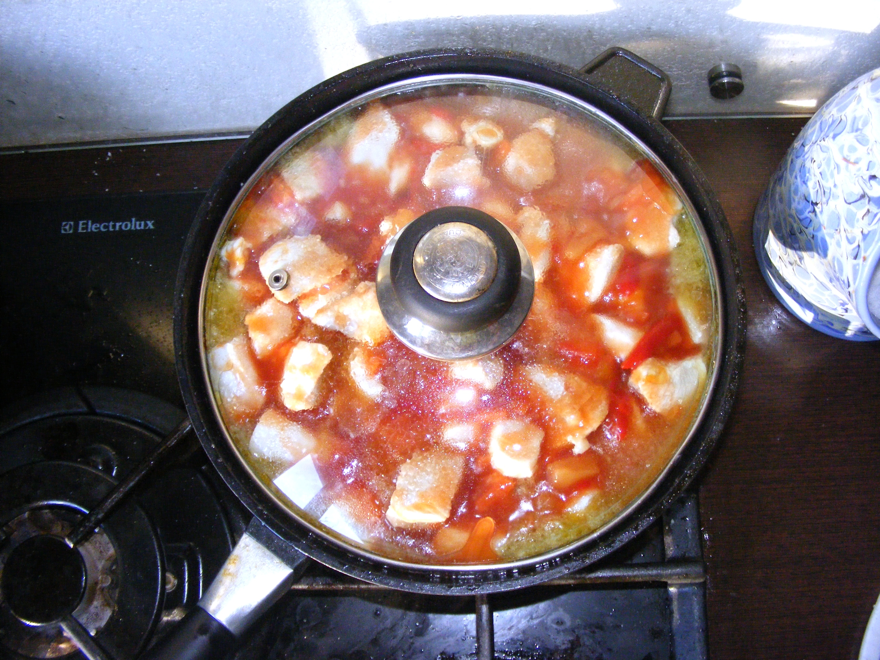 Добавляем соус, сбавляем газ, накрываем крышкой ...