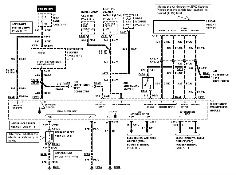 На втором листе - ещё питание, выход на ту лампочку "чек эйр райд", разъем тест-коннектора (о нем в другой раз), 4 провода на датчик высоты и выключатель в багажнике, понизу - это земля и 6 проводов опять для системы гидроусилителя. Самое интересное - вход от датчиков открытия двери (вверху в середке).