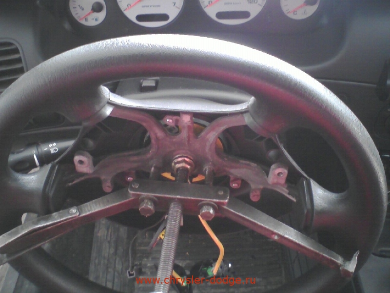 Далее пробуем снять руль сначала без съемника, таким макаром: схватившись за руль слева и справа, начинаем его хорошо расшатывать (влево и вправо соотвественно) и при этом тянуть руль на себя. Если повезет вы его снимите, а накрученная гайка не даст вам дать рулю по физиономии *17 . Если не повезло, то надо искать или собирать съемник. Кстати скажу, что на руле есть две свободные резьбы (походу под съемник и заточенные), так там метал очень мягкий и есть риск сорвать их. Ну в общем считаем что вам удалось снять руль. Если да, то увидите вы под ним вот это: