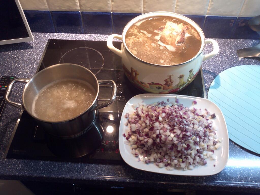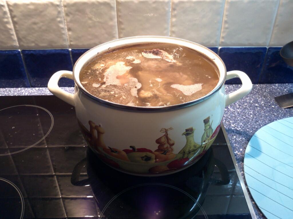 Разбавляем бульон водой, иначе подагра гарантирована, мечем лук и ореховую