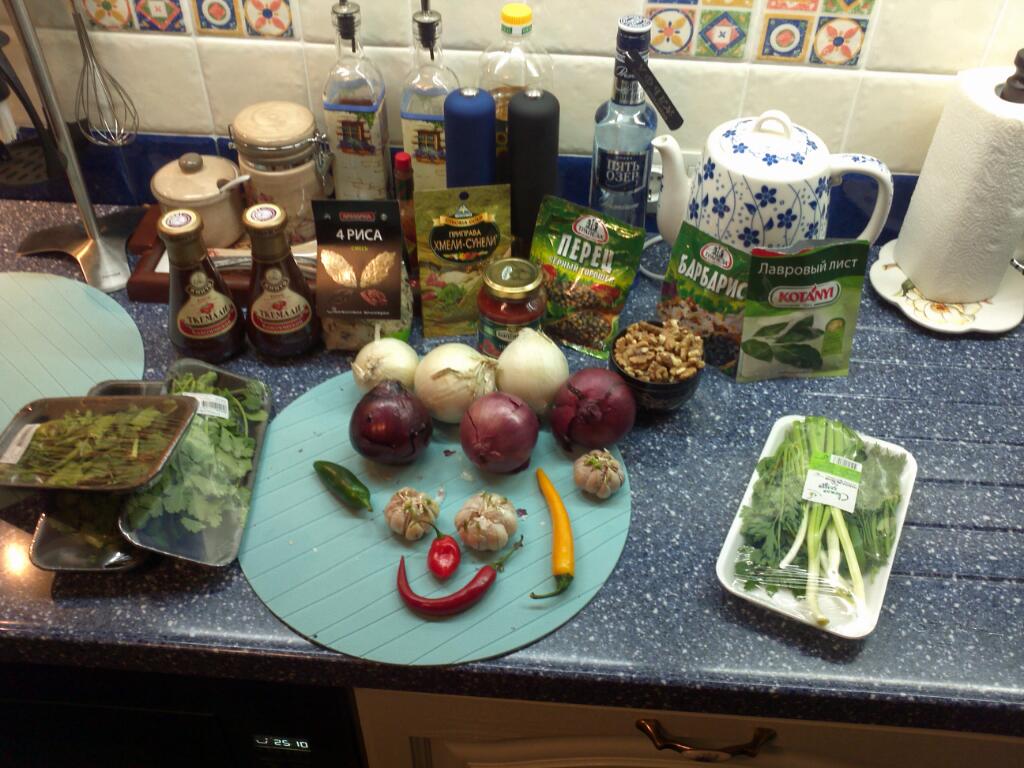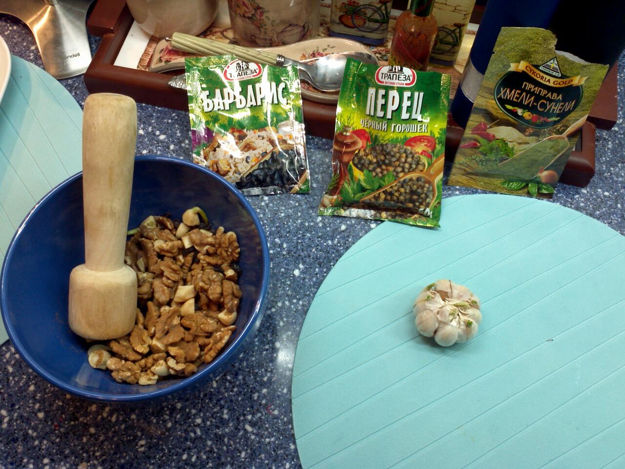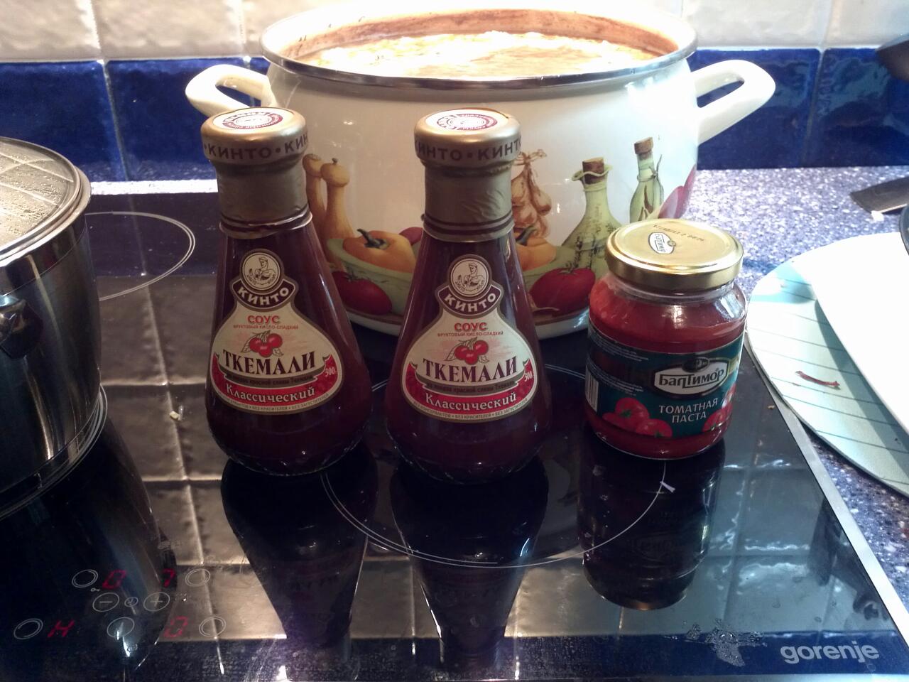 Соус ткемали, хмели-сунели, перец, томатную пасту за неимением наманых помидор,