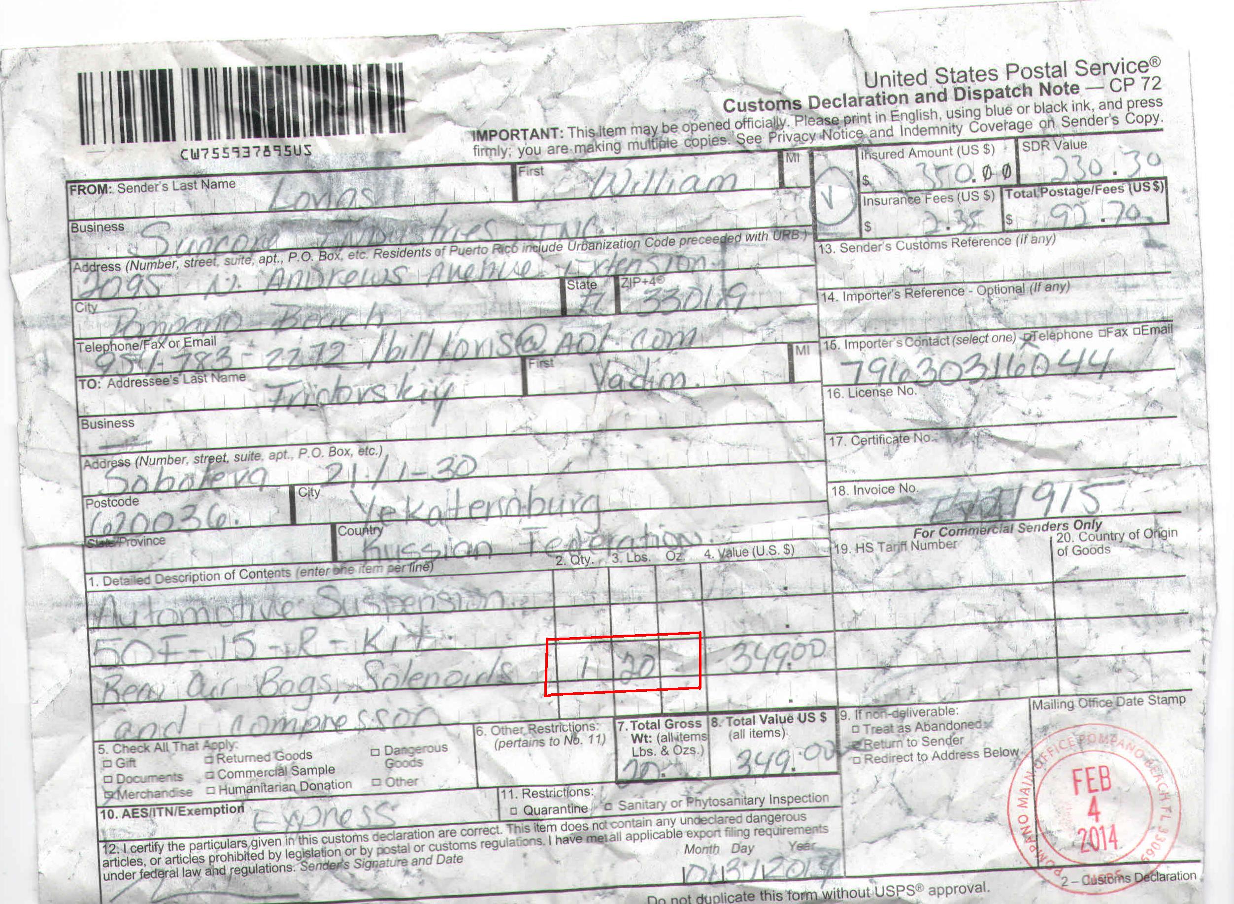 И ещё. Какой документ подтверждает, что usps приняла 9 кГ? А то написал, что такое было, а откуда дровишки?...
