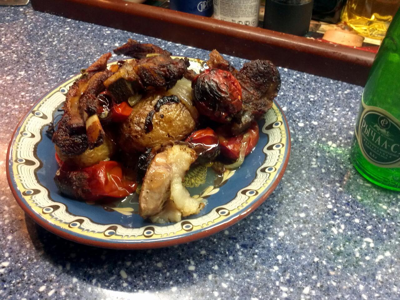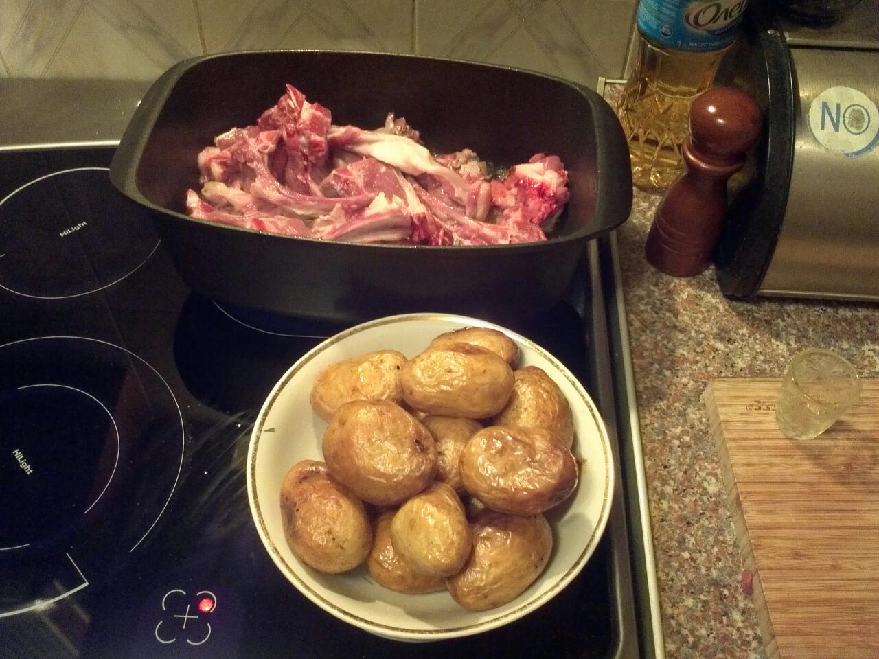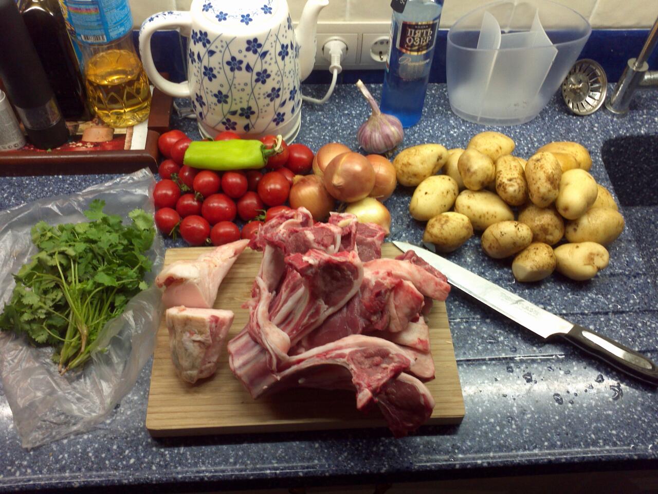 Берём корейку барана, мелкий картофель, курдюк, помидоры, лук.