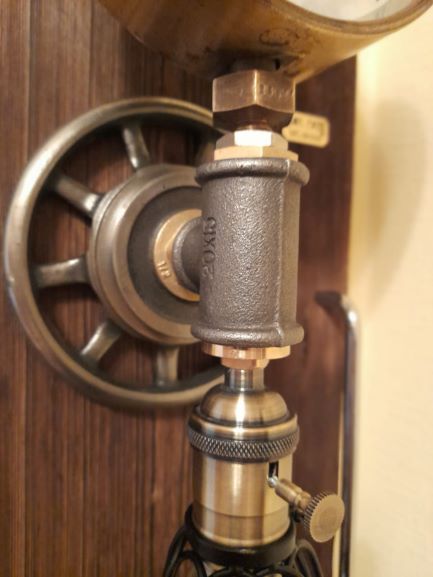 2. Настольная лампа - колесо Singer, деталь испарителя газового фонаря, три ретро патрона. лампы Эдисона, выключатель - цепочка, трубы и фитинги 1/2".