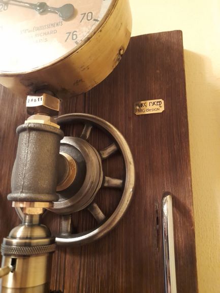 1. Бра с лампой Эдисона, лофт - абажуром и манометром от паровоза (от вакуумного тормоза) 1911 года. Выключатель в патроне, матерчатый ретро-провод. Закреплено через маховик от Singer'a на брошированной и обожженной старинной доске. Ценник 18500 р.