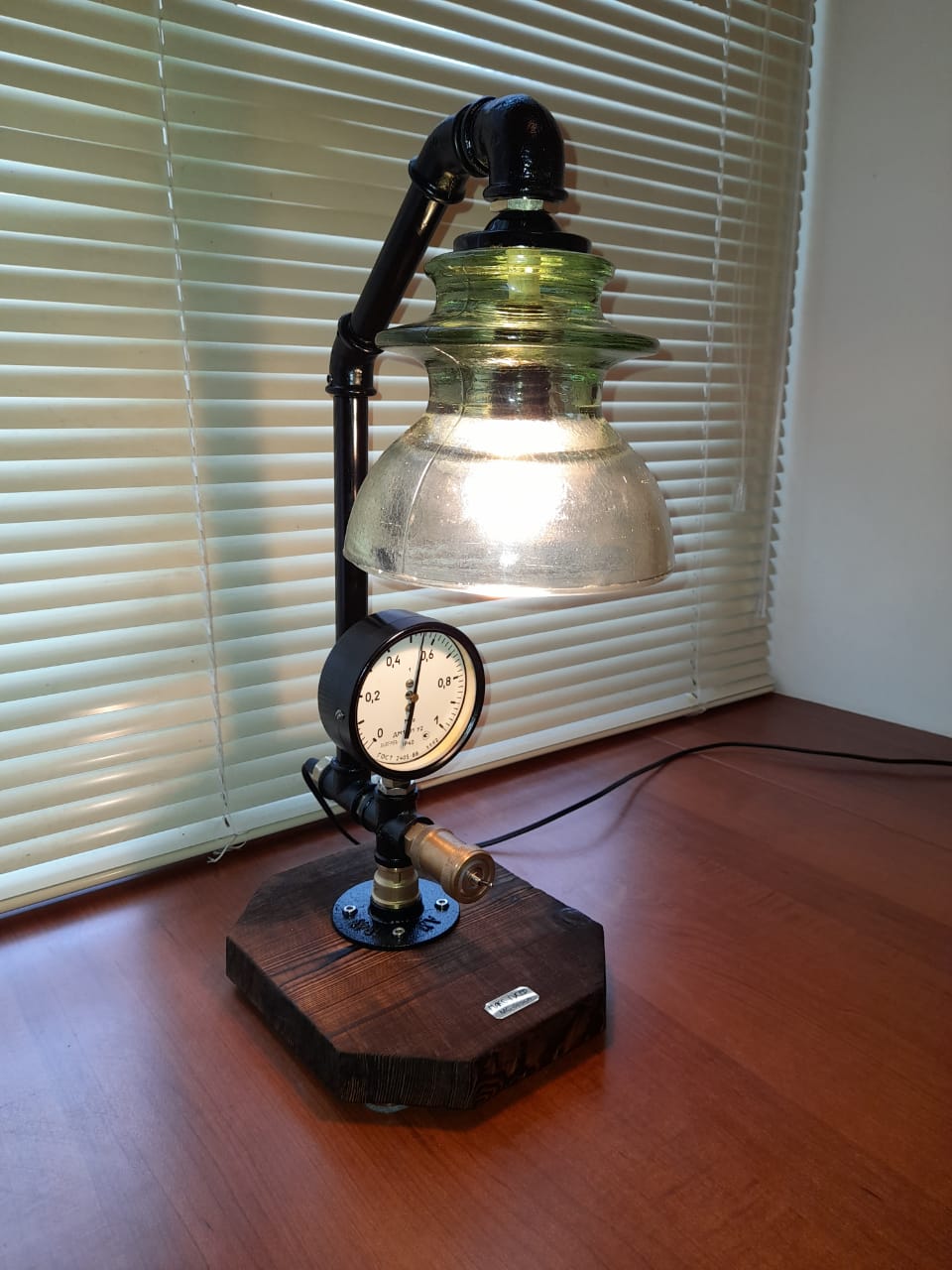 Добавлю еще одну. Плафон сделан из высоковольтного стеклянного изолятора, выключатель врезан в корпус пневмоклапана. Лампа Е14. Стоит на лофт фланце и куске брошированной старой доски. 15000.