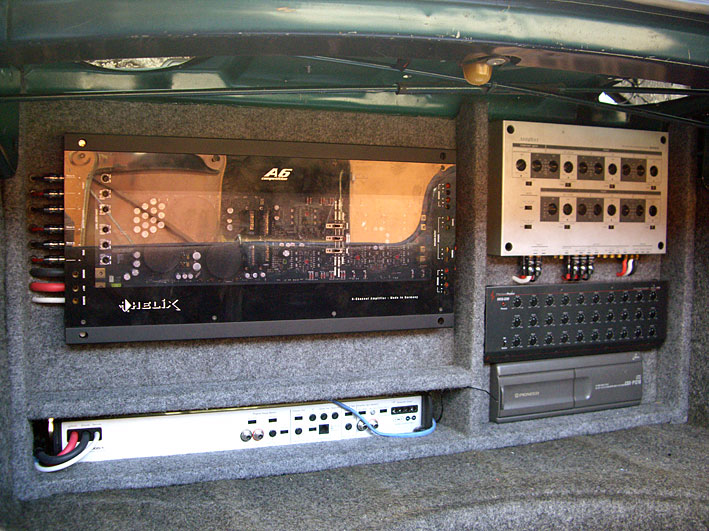 Использован 5 канальник из экономии места, что не очень гуд. Усь расположил в заднем крыле, на месте штатного уся с головкой и отлитым по внутренней форме крыла объемом - интересная штатная конструкция, все в одном блоке. Штатная головка, хотя и 8, но двухобмоточная, прошитая, выглядит достойно, правда без опознавательных знаков. Дверные динамики штатно были смотированы в пластиковых коробах, 5 на 7 или что-то вроде этого. Их пришлось выкинуть и немного повозившись поставить на перед 16, на зад 13. Твитера поставил на торпеду в лобовуху. Работают на отражении. Кросы - в торпеде. Разнесенка на задних дверях ненужна, но у меня просто было. Динамики, твитеры, кросы - все в задних дверях. Ченжер идеально встал в карман с крышкой в левой части багажника. TV тюнер никуда не влезал, пришлось запихнуть под обшивку заднего левого крыла. Кларионовскую ТВ антенну поставить не удалось из-за размеров, поставил клеющуюся Alpine. Шумка в дверях - STP (иначе гудят и дребезжат по страшному). Позже пришлось и крышу проклеить - гудит. Корпусной саб встал в натяг за третьим рядом сидений. Подключен на бананах, поэтому если надо место - вынимаешь его и оставляешь в гараже. По-поводу ТВ тюнера - лишний геморой. На ходу картинка скачет, а если стоишь, то надо еще машину покатать туда - сюда. Типа как на маленьком телевизоре усы крутишь, а здесь всю машину. Наилучший прием обеспечивают четыре рога на крыше плюс диполь, но надо крышу дырявить, проводка ... куча кабелей.. короче неохота возиться. Апарат 1 дин, в свободное место засунули пластиковый карман от девятки. Немного подделали и получилась полка для пультов и прочей мелочи. Музыка и DVD очень неплохо, ТВ - так себе. Все управляется с тач-скрина по сенету - очень удобно, просто жмешь пальцем на выпадающие меню - класс! Можно еще камеру заднего вида воткнуть, но тоже вещь в себе, у меня на другой машине штатно стоит, покрывается грязью быстрее чем стекло, ни черта на видно!