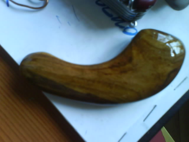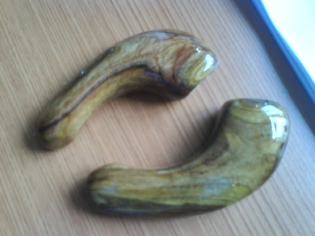 Взял хороший сушеный пенек от вишни ... или от сливы... Выточил эти самые рукояти-бобышки, шазкурил, шлифанул, в четыре слоя корабельным лаком покрыл. Вот что вышлшо.