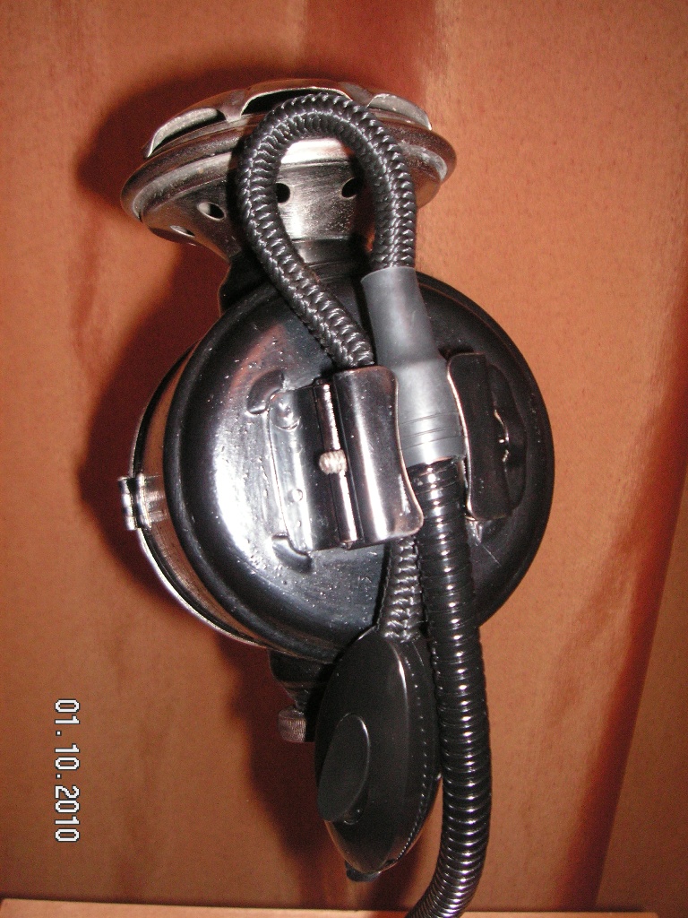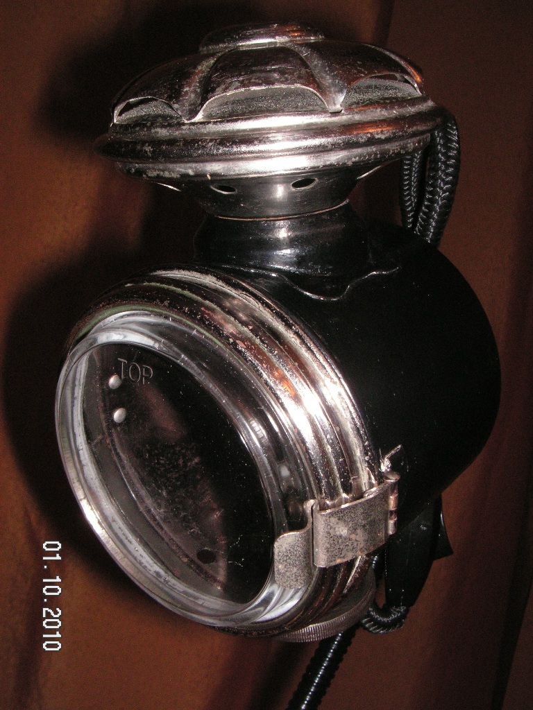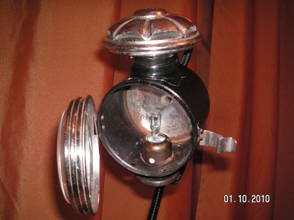 Итак, недавно на барахолке мне посчастливилось по дешевке купить ацителеновый фонарь самого начала 20-го века. То ли автомобильный, толи каретный - сие нам неведомо. Сразу решил сделать из него очередную настольную лампу. Хром в не плохом состоянии и я его не трогал, оставил "благородную патину". В качестве основания использовал маховик от швейной машинки "Зингер", от нее же и некоторые мелкие детали. Корпус и спицы маховика зачистил и покрасил в радикально черный цвет (собственно, как и было 100 с лишним лет назад). Ножку ампутировал от специально приобретенной лампы-донора, стекло, взамен родного плоского, мутного и уже основательно потрескавшегося, подошло от противотуманки "made in China", приобретенной в Южном порту. Немного поколдовал с электрикой и вкрячил вместо фитиля патрон под галогенку. Для пущей винтажности заправил проводку в чулок от репшнура, из которого удалил сердцевину. Получиля шнур в ниточной оплетке. Вот результат: