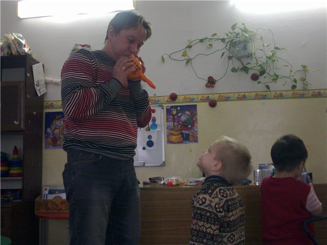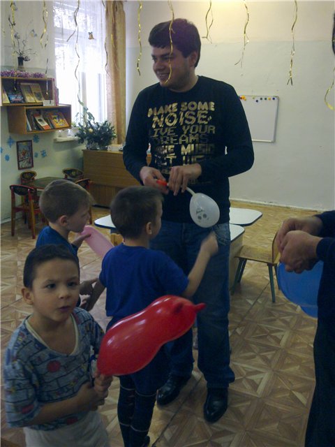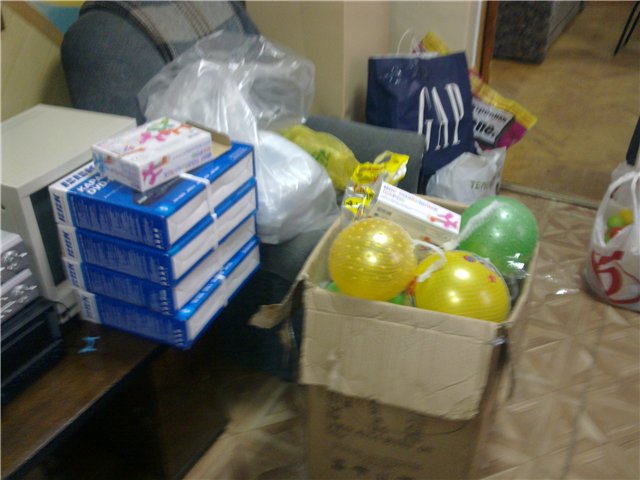 Нам, как всегда рады. Потихоньку перетаскав коробки и пакеты по скользкой лестнице, рассортировали "подарки" и разбрелись по группам. Сначала на первом этаже, потом перешли на второй. В первой группе, я опять побеседовал с воспитателем(не знаю как её зовут)с которым разговаривал в прошлую поездку на предмет "актуальных" нужд ДД. Прошлись по предыдущему списку, кое чего вычеркнули, кое чего добавили. Видно, что она(воспитатель) искренне "болеет" за детей и ей действительно "интересно" с ними заниматься. Ребята конечно же рады гостям, чего то там орут, тащат каждый за собой, хвастаются подарками. Шум, гвалт, возня. В общем, для них, это конечно же целое событие. В других группах явно не тише. Надувные шарики - хит сезона, а если учесть что насос оказался почему то один, собралась целая очередь, даже подраться успели. К слову сказать, все детишки одеты, выглядят опрятно, даже разглядели на них обувь, которую привозили в прошлый раз. Мальчиков заметно больше девочек, в одной группе вообще одни мальчишки. В старших группах, дети в большинстве обычные ребятки, особых отклонений не заметно. Видно как с возрастом и заботами воспитателей, детки меняются в лучшую сторону.