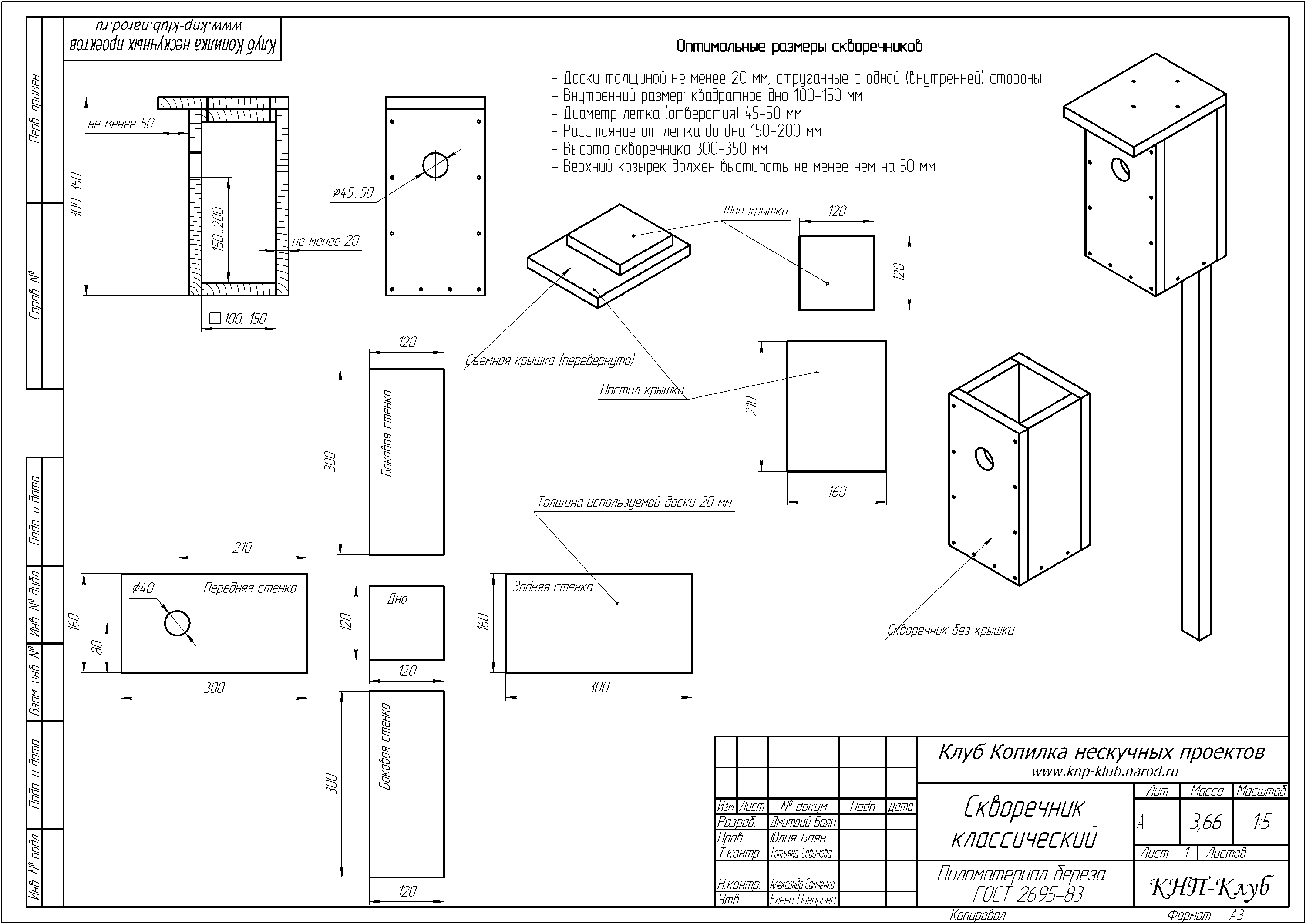 Чертеж из сети прилагаю, может кто заинтересуется. На днях сооружу еще несколько - повешу в парке у реки, школьники в последние годы перестали этим заниматься как раньше. Свои еще думаю покрыть тёмным антисептиком и мягкой кровлей под черепицу для пущей долговечности.