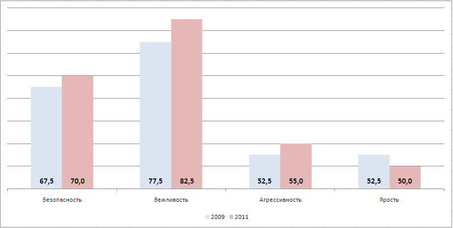 -5% Ярость Тоже похоже на правду – стал старше и опытнее за эти два года, машина одна и та же, второй ребёнок появился … вот и ярости меньше, безопасности и вежливости больше! А вот агрессия растёт судя по всему из-за тенденций в первой части сообщения